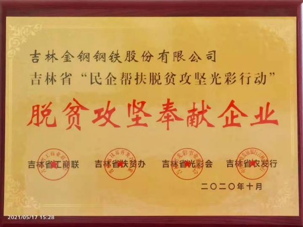 公司在吉林省“民企幫扶脫貧攻堅光彩行動”中,被吉林省工商聯(lián)、吉林省扶貧辦、吉林省光彩會、吉林省農(nóng)發(fā)行等聯(lián)合評為“脫貧攻堅奉獻企業(yè)”。